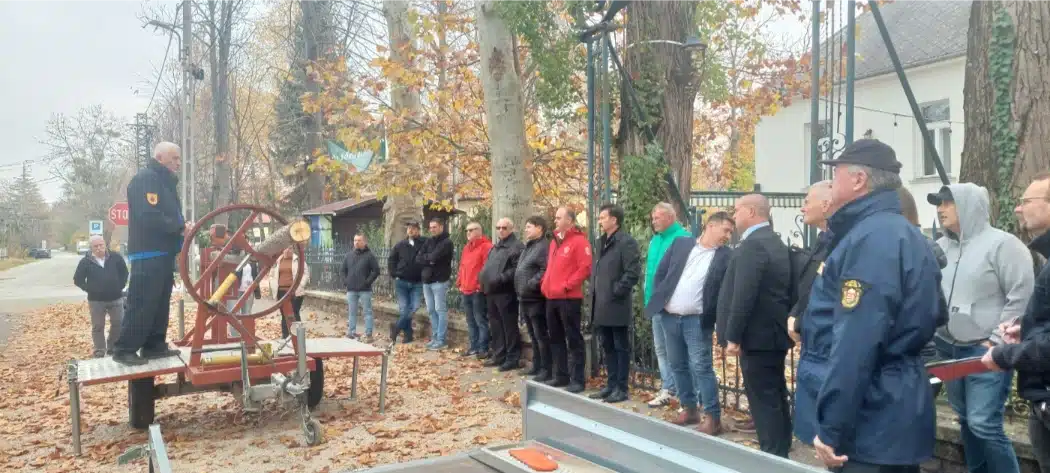 Bodó László, a KÖTÉL ÖTE parancsnoka a szélviharok által megdöntött fákban keletkező mechanikai feszültségekről tartott gyakorlati bemutatót a feszültség alatt álló fa vágástechnikai szimulátorával.
